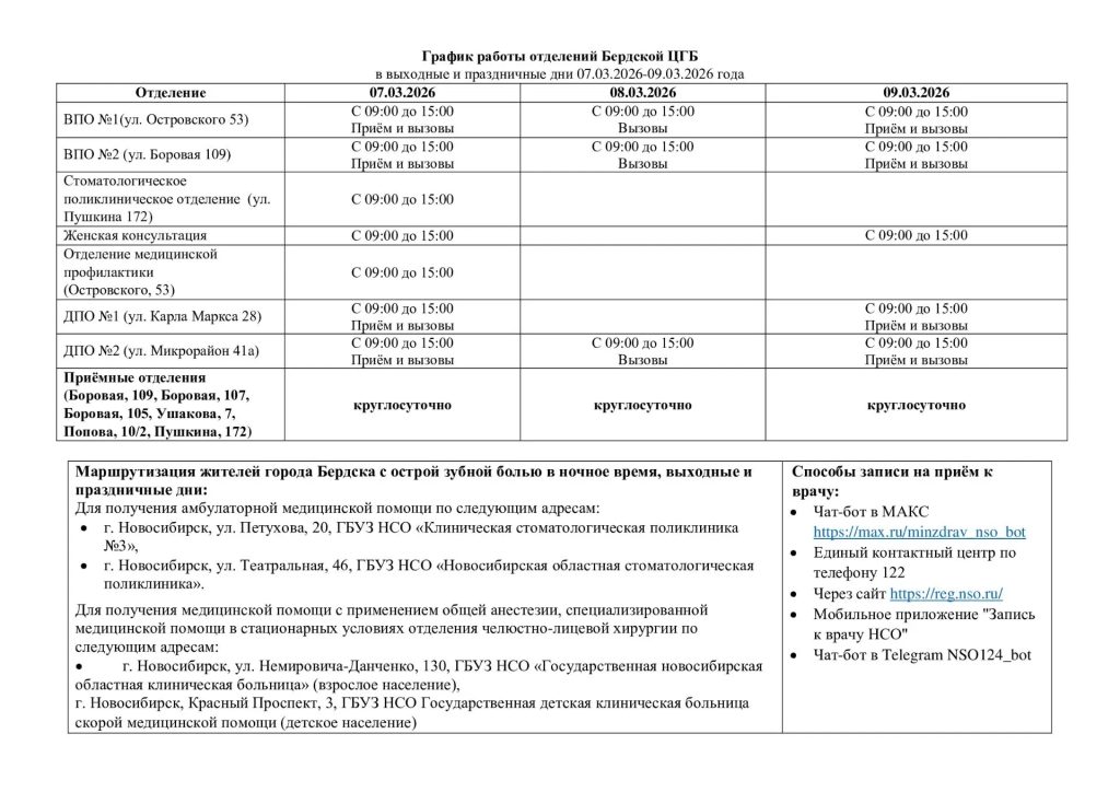 В женской консультации принимать пациентов будут 7 и 9 мая, а в стоматологическом отделении – только 7 числа (в другие дни горожан с острой болью будут принимать в клиниках Новосибирска).