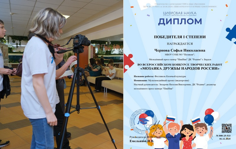 Диплом Победителя I степени в номинации «Мультимедийный проект» (видеоролик) завоевала юнкор молодежного пресс-центра «ПикНик» дворца культуры «Родина» Софья Чернова.