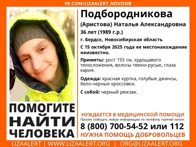 Местонахождение 36-летней Натальи неизвестно с 15 октября, сообщают в поисковом отряде “ЛизаАлерт” Новосибирской области. Также отмечается, что она нуждается в медицинской помощи.