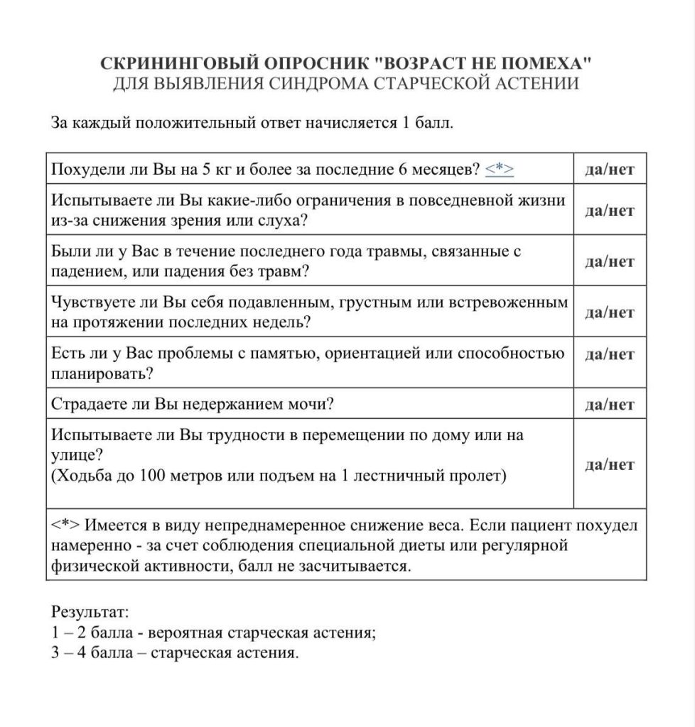 Ответить на этот вопрос поможет тест «Возраст – не помеха», который включает в себя 7 вопросов. Пройти его пациенту могут предложить, например, у терапевта или в рамках диспансеризации. Если человек на три вопроса и более отвечает положительно, то направляется на консультацию к врачу-гериатру. Если же таких ответов более 5-ти, то наблюдаться у этого специалиста необходимо – в этом случае риск развития гериатрических синдромов и старческой астении выше.