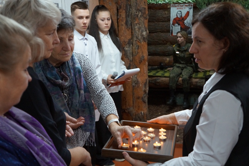 Присутствующие на открытии зажгли свечи памяти в честь тех, кто выполнил свой долг Родине. Ученица школы Марина Наумова исполнила песню «Ах, эти тучи в голубом!», а также рассказала, что тоже принимала участие создании Землянки: «Здесь все в основном делали рабочие. Но мы тоже помогали: убирали, обставляли землянку. И для того, чтобы проникнуться темой, слушали военные песни».