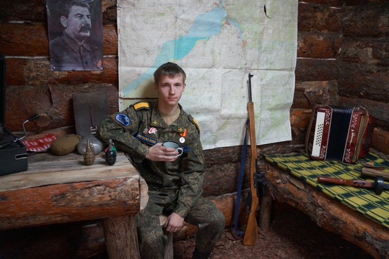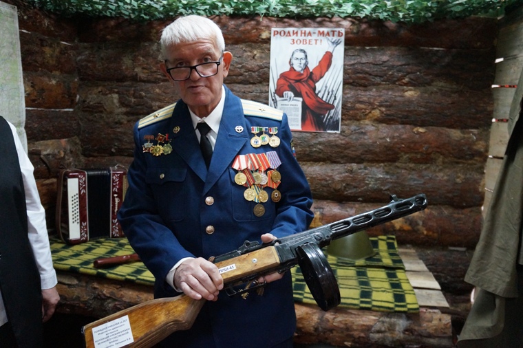– Было желание оформить «Солдатскую землянку» максимально правдиво. Стены землянки обшиты деревом, мы заказали печку. Сложность была в том, чтобы найти все атрибуты военного времени. Допустим фляжку или плакат «Родина мать завет!» нашли без проблем. А вот последнему штриху землянки – портрету Сталина, лично я посвятил три дня. Дело в том, руководителя страны Иосифа Сталина чаще печатали в форме Генералиссимуса. Но землянка относится к начальному периоду Великой Отечественной войны. А всем известно, что это высокое звание присвоено главнокомандующему в июне 1945 года. С большим трудом, но я все-таки нашел фотографию Сталина в костюме. Так что нам за землянку не стыдно, а напротив, мы гордимся результатом нашей совместной работы. Здесь даже есть результат творчества наших детей: вот, например, макет автомата «ППШ-41» в натуральную величину, который изготовил ученик Николай Пожидаев.
