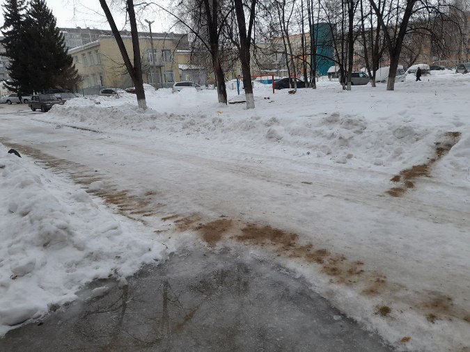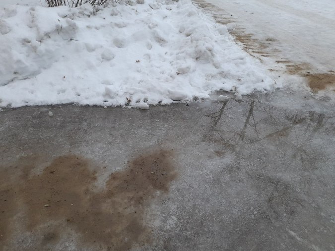Потепление привело к тому, что выпавший снег повсюду растаял. И дорожки во дворах покрылись льдом. Лед и лужи – довольно-таки неприятное соседство.