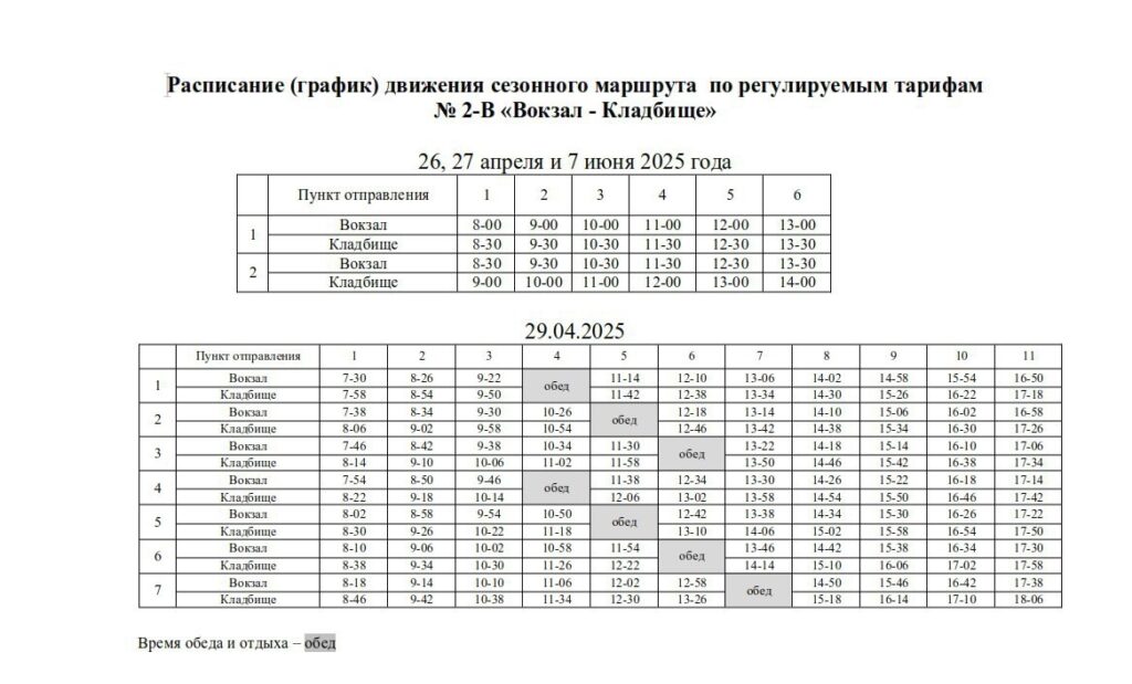 – маршрут 2В «Вокзал — Кладбище» будет осуществлять движение 26, 27, 29 апреля и 7 июня согласно расписанию.