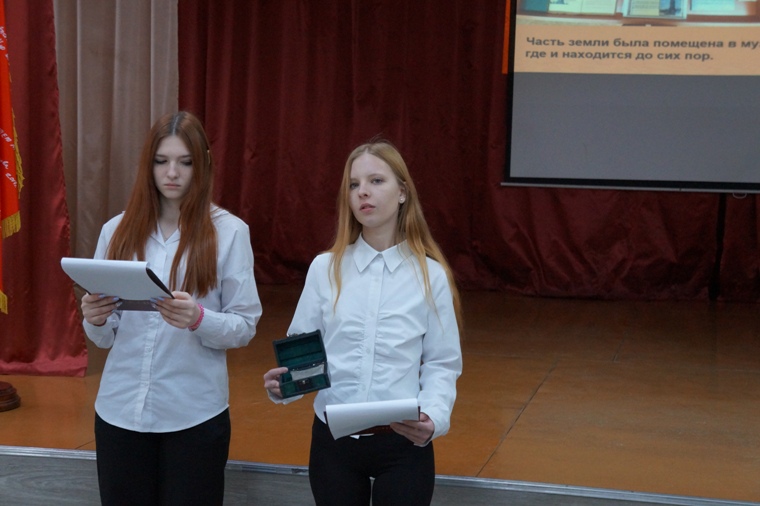Ребята из школы №11 показали присутствующим уникальный экспонат музея – горсть земли из деревни Петрищево, где погибла Зоя Космодемьянская. Когда началась война, девушка вступила в ряды комсомольского ополчения для диверсионных операций в тылу врага. 28 ноября 1941 года Зою схватили, пытали, но она не выдала своих товарищей. Зоя Космодемьянская стала первой женщиной, получившей звание Героя Советского Союза в годы Великой Отечественной войны.