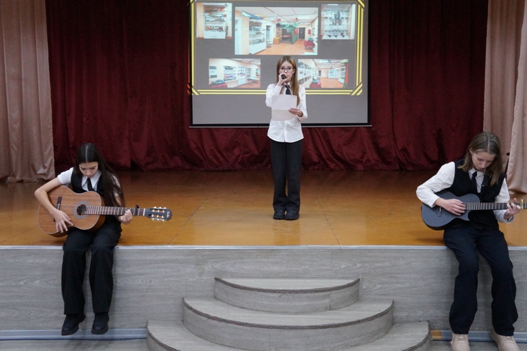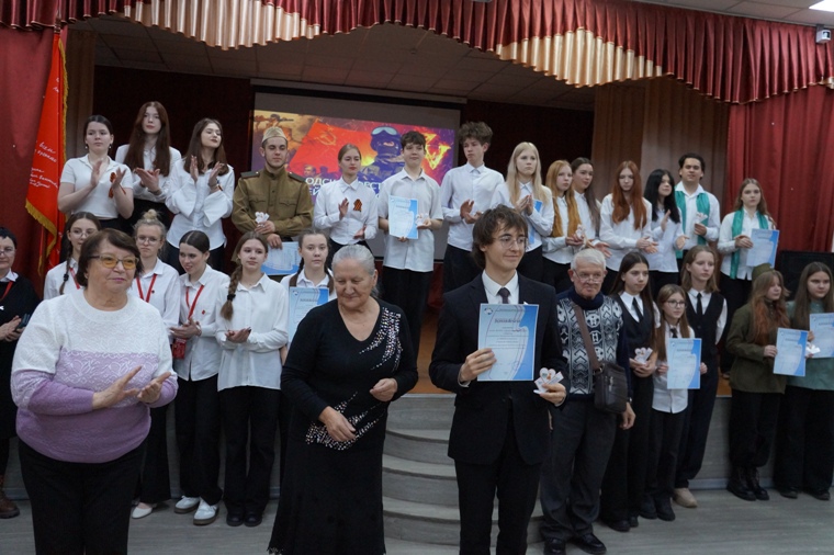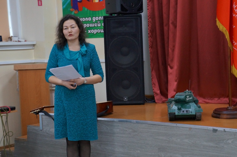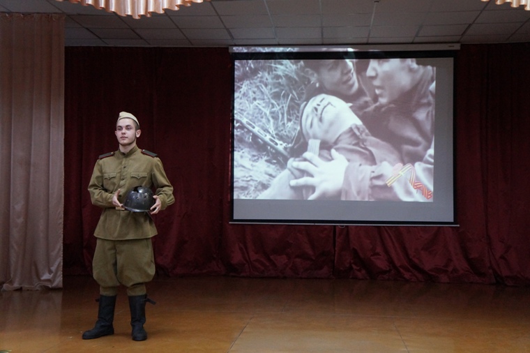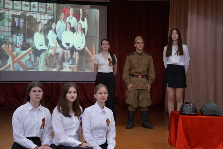 В заключение десятиклассники исполнили песню под аккомпанемент директора школы Евгения Викторовича Величко (кстати, он ее автор). Дети пели о старой каске, которая напоминает о том, что наши деды и прадеды встали на защиту родной страны на смертный бой, и их внуки гордятся ими. Но сегодня каска снова «в строю»: вновь настало время защищать Родину, и новые Герои готовы покрыть себя вечной славой….