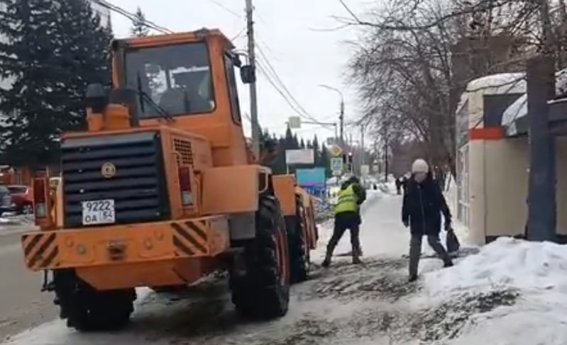 На улице Ленина прямо сейчас посыпают песком тротуары и остановки. Для этого используют трактор и, конечно, ручной труд – песок разбрасывает рабочий.