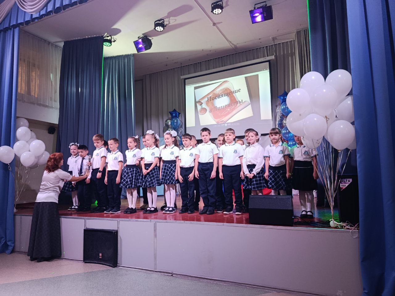 Первоклассники по очереди показали свои представления, а затем все вместе поклялись получать хорошие оценки и изучать науки. К ним обратилась директор лицея №7 Татьяна Трубина, которая назвала этот день необычным и рассказала, что здесь есть одна необычная традиция – передавать первоклассникам во время посвящения огонь знаний.