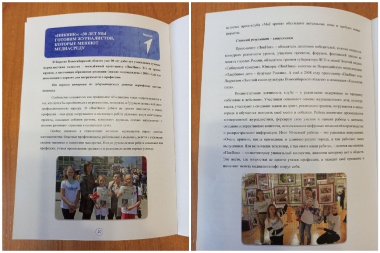 Успешные практики детских и молодёжных организаций региона вошли в сборник, изданный Новосибирским государственным педагогическим университетом по заказу «Движения Первых». В сборник включили опыт бердского пресс-центра «ПикНик» ДК Родина», которым руководит журналист газеты «Бердские новости» Наталия Захарова.