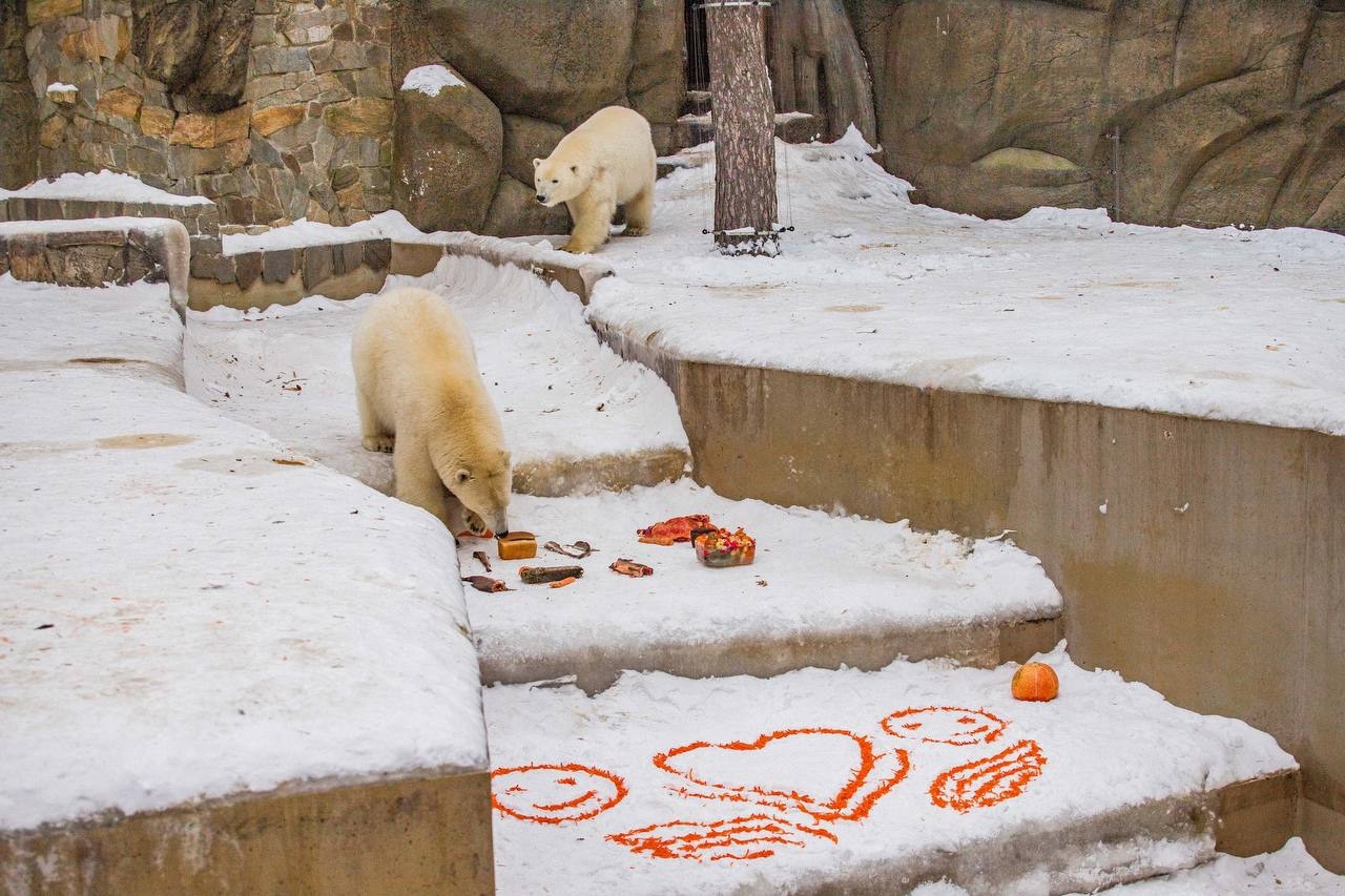 В зоопарке медведиц поздравили по традиции с помощью праздничного обеда. На этот раз сотрудники учреждения на снегу выложили из овощей сердечко и смайлики.