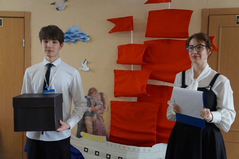 Команды расположились за своими столиками. Все волновались, но окружающая обстановка была пронизана романтическим настроением, который настраивал ребят на творческое состязание и давал простор фантазии. За спиной ведущей возвышался белый корабль с алыми парусами и главными героями, словно сошедший со страниц книги. На стене оформили выставку по итогам домашнего задания: команды нарисовали свой корабль мечты и написали продолжение истории, как могли бы сложиться судьбы Грея и Ассоль в дальнейшем. А еще в этот день школьники пели замечательные песни про океан и паруса, про то, что Грей нашел свою Ассоль, и про настоящую дружбу.
