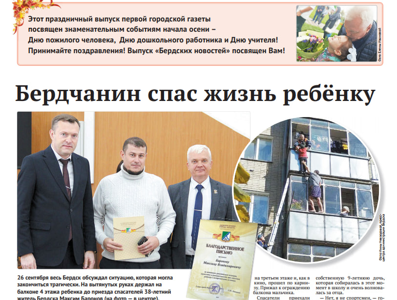 1 октября вышел в свет праздничный выпуск “Бердских новостей”. Он посвящен знаменательным событиям начала осени – Дню пожилого человека, Дню дошкольного работника и Дню учителя. Принимайте наши поздравления!