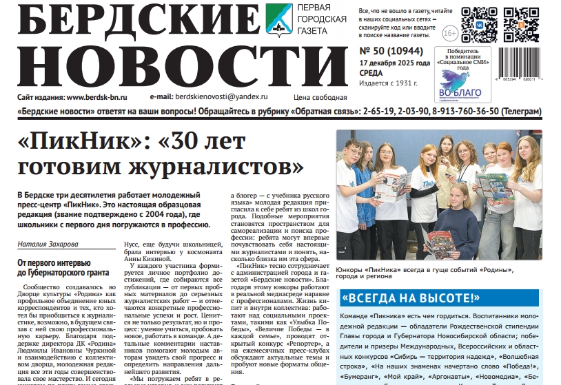 17 декабря вышел в свет новый выпуск “Бердских новостей”. В новом номере вы найдете множество интересных публикаций, которые рассказывают про происходящие в нашем городе события и бердчан.
